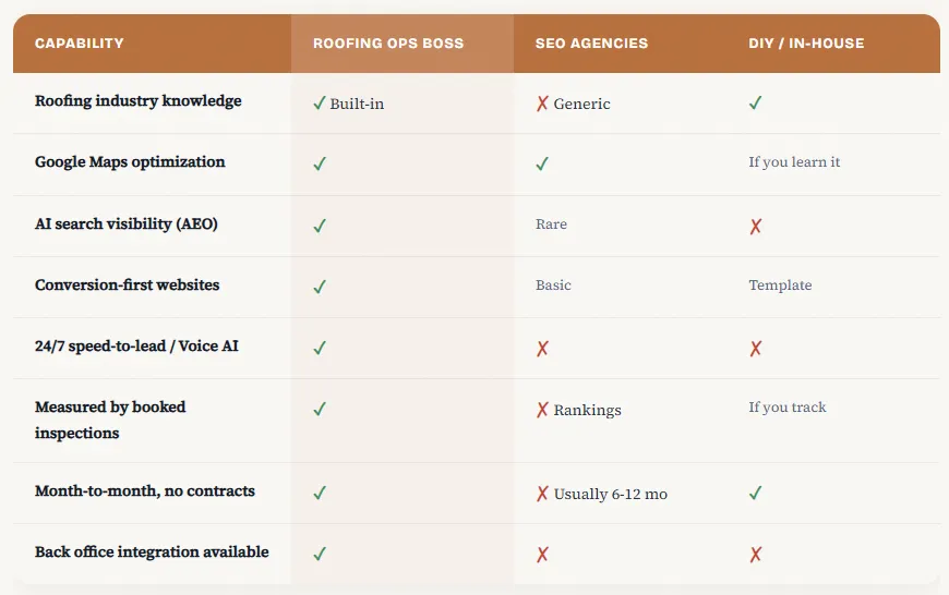 Roofing Ops Boss marketing packages cover local visibility, AI search optimization, conversion-first websites, and 24/7 speed-to-lead automation — with month-to-month terms and no long-term contracts. Every package is measured by booked inspections, not vanity metrics.